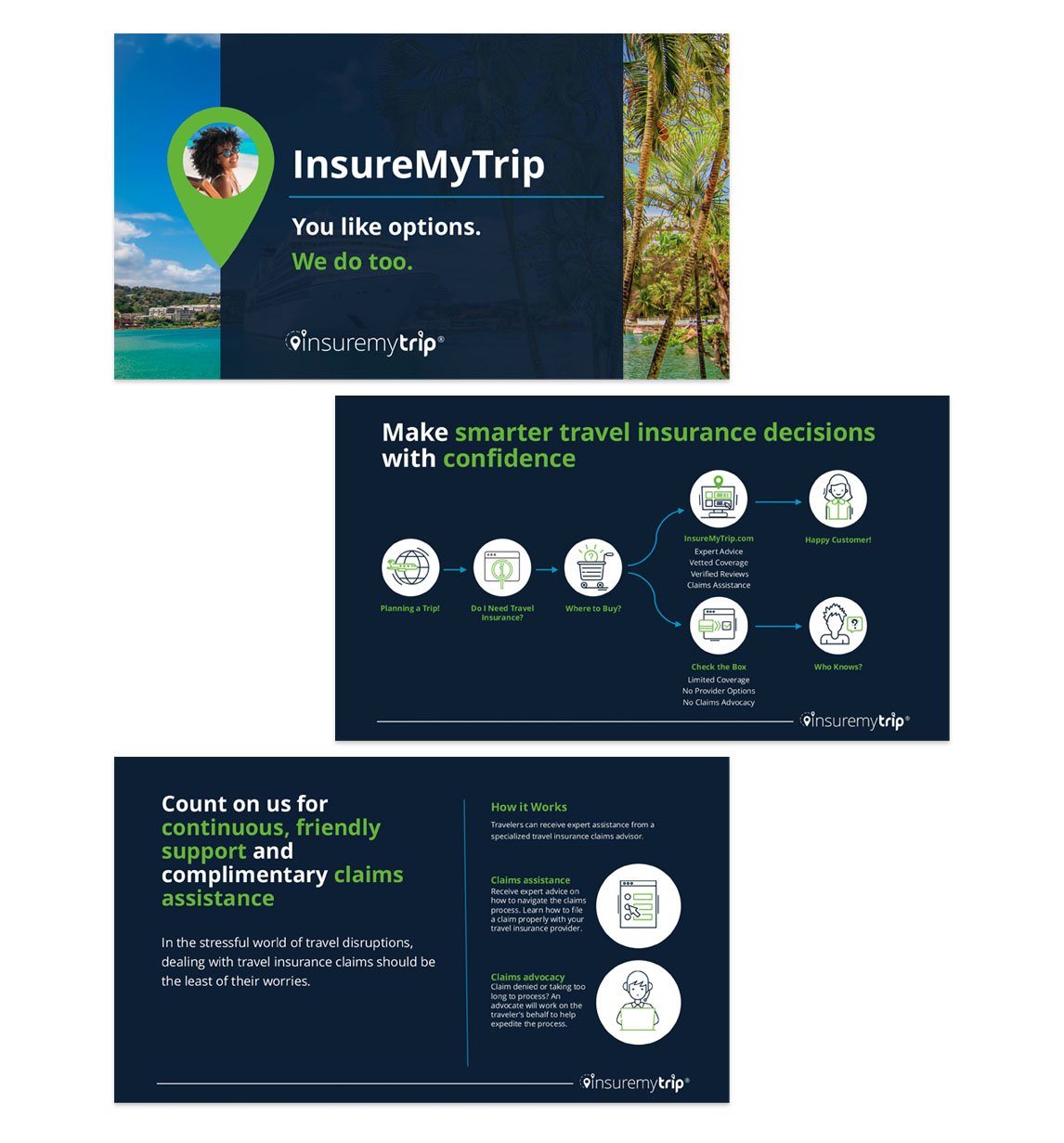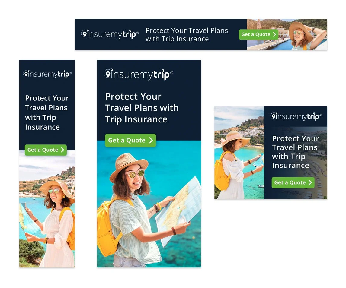 Request: Full rebrand of InsureMyTrip, a travel insurance comparison website. Elements including logo, color, typeface, and all branded elements including site, digital ads, marketing materials, video, trade show properties, and more